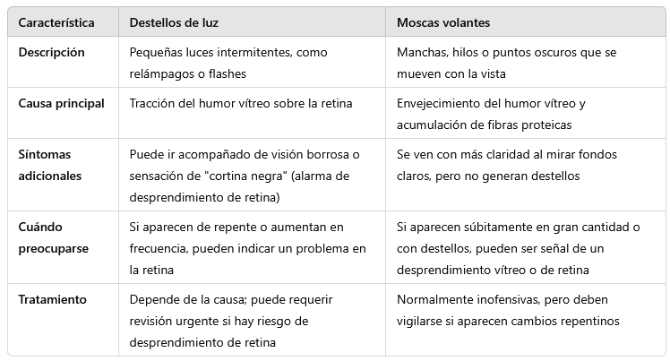 No, aunque suelen presentarse juntas, los destellos de luz y las moscas volantes tienen orígenes distintos. Los destellos se deben a la estimulación de la retina, mientras que las moscas volantes son pequeñas condensaciones del vítreo que proyectan sombras sobre la retina.